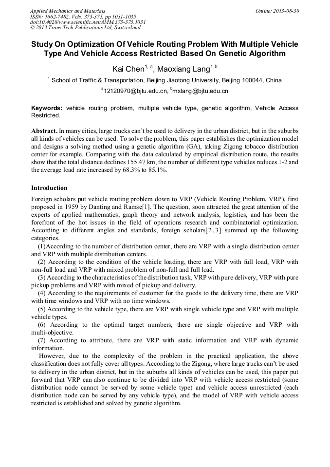 Study On Optimization Of Vehicle Routing Problem With Multiple Vehicle Type And Vehicle Access Restricted Based On Genetic Algorithm Scientific Net Vehicle Tracking System Android App Code